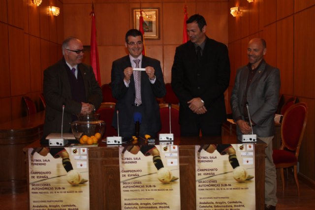 Esta mañana se ha realizado el sorteo del Campeonato de España de Selecciones Autonómica Sub-16 de Futbol Sala Femenino, que se celebrará en Torre-Pacheco del 16 al 20 de marzo y se disputará en los pabellones Virgen del Pasico (Torre-Pacheco), Pabellón Gabriel Pérez (Roldán), pabellón Nuestra Señora del Rosario (Balsicas) y el Pabellón Nuestra Señora de la Consolación (El Jimenado)
