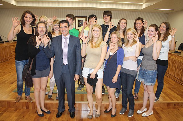 El alcalde de Torre-Pacheco, Daniel García Madrid, ha recibido hoy, en el Salón de Plenos del Ayuntamiento, a un grupo de 14 alumnos alemanes y 2 profesores del Instituto Nige, en Esens (Alemania). En este acto de bienvenida, el alcalde les ha presentado el municipio, hablándoles de la cultura y las costumbres de los pachequeros; además, también han repartido entre los alumnos extranjeros una bolsa llena de pequeños obsequios y regalos para que no se olviden de su estancia en Torre-Pacheco.