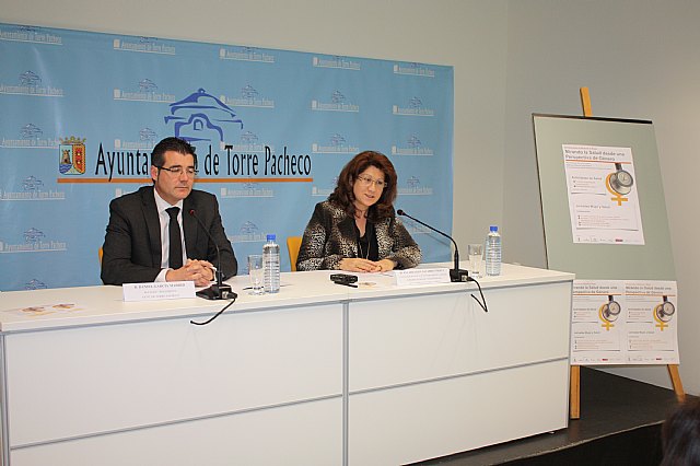Esta mañana el alcalde de Torre-Pacheco, Daniel García Madrid, junto a la concejala de igualdad, Encarnación Navarro, han presentado las actividades programadas  para la celebración del 8 de marzo, Día Internacional de la Mujer, que se celebrará del 6 al 9 de marzo bajo el título de “Semana para la salud de la mujer” con el objetivo principal de incorporar una mirada de género sobre la salud que permita hacer visibles a las mujeres en sus ciclos de vida y en sus diferencias.