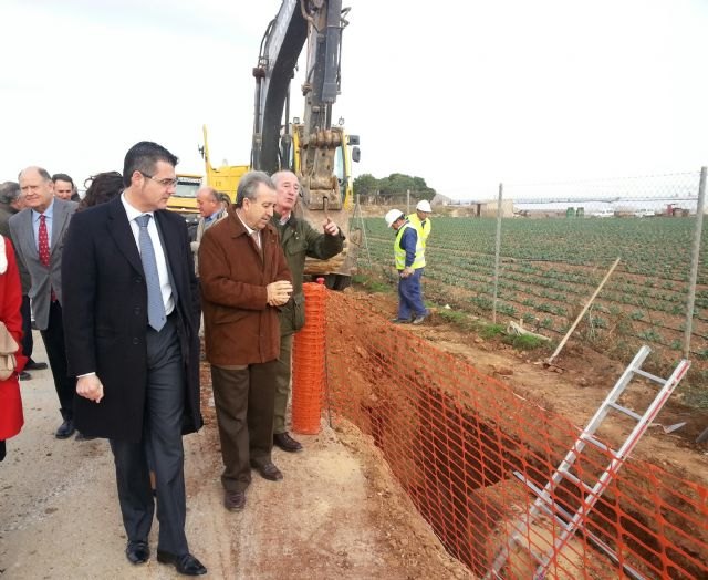 El consejero de Agricultura y Agua, Antonio Cerdá, y el alcalde de Torre Pacheco, Daniel García, visitaron hoy las obras del colector de Camachos, que prestará servicio a una población equivalente a mil habitantes, cuyas viviendas quedarán conectadas a la depuradora principal. Este colector, de 5,1 kilómetros de longitud, recogerá las aguas de las zonas diseminadas para su tratamiento y posterior reutilización en el regadío de la zona.