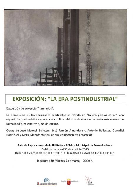 La Consejería de Educación, Cultura y Universidades organiza, en colaboración con el Ayuntamiento de Torre-Pacheco, la exposición ‘La era postindustrial’, una muestra que se incluye en el proyecto ‘Itinerarios’ y que se podrá visitar en la Sala de Exposiciones de la Biblioteca Municipal hasta el próximo 30 de abril.