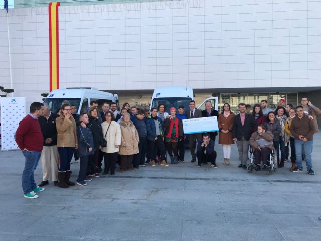 Tras la firma del convenio se ha procedido a la presentación del nuevo microbús que la Asociación Aidemar ha adquiero para la realización de las rutas en el municipio de Torre Pacheco, con la ayuda de la Obra Social La Caixa. El director de área de negocio del Mar Menor, Alberto Sánchez Abellá, acompañado por el director de la Oficina de Torre Pacheco, José Manuel Conesa, han hecho entrega de un cheque por valor de 25.000 euros que contribuye a la compra del nuevo vehículo que mejora el servicio de transporte que desde la Asociación se ofrece a los usuarios.