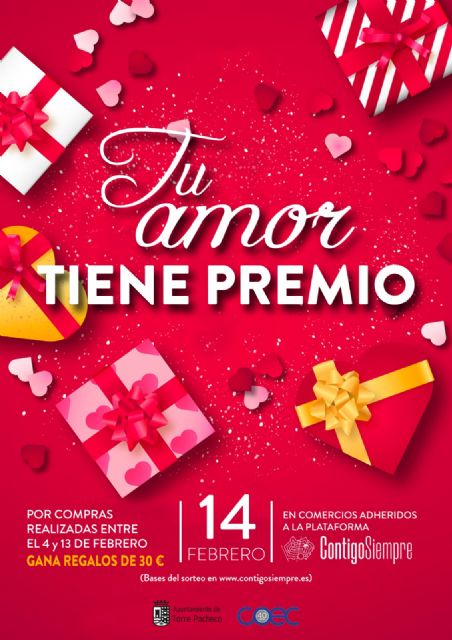 La concejalía de Comercio del Ayuntamiento de Torre Pacheco en colaboración con COEC Torre Pacheco, organizan "Tu amor tiene premio", concurso para San Valentín cuyos premios incluyen 20 tarjetas regalo por valor de 30 euros cada una.
