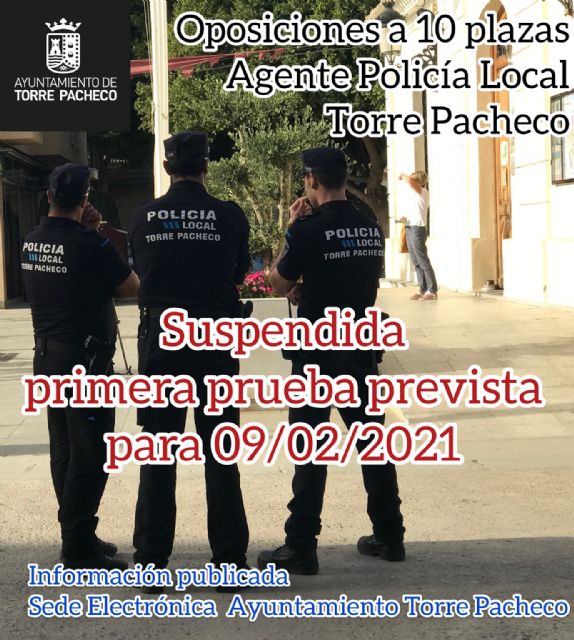 Atendiendo a las indicaciones de la Dirección General de Salud Pública, y dadas las actuales limitaciones sanitarias y legales, se suspende la realización de la primera prueba de la oposición para agente de policía local, convocada inicialmente para el próximo martes 09 de febrero a las 10.00h.