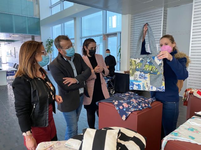 La concejala de Servicios Sociales, María José López acompañada por la directora de Proyecto Abraham, Nuria García y el concejal de Cultura, Raúl Lledó han clausurado el curso de costura “Camina entre Telas”, coincidiendo con una muestra de los trabajos realizados por las participantes, en el Ayuntamiento de Torre Pacheco.