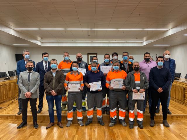 El alcalde de Torre Pacheco, Antonio León acompañado por el concejal de Salud, Oscar Montoya y el Responsable Territorial de Seguridad y Salud Laboral de la Fundación Laboral de la Construcción, Francisco Javier Valverde han asistido al acto de entrega de diplomas a los trabajadores del Ayuntamiento que han realizado la formación en Riesgos Laborales.