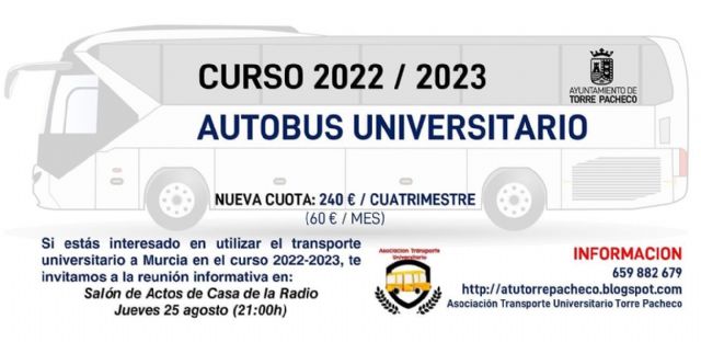 Con el fin de informar sobre este nuevo abono, el próximo jueves 25 de agosto se realizará una reunión para las familias y estudiantes interesados en este servicio,  en el salón de actos de la Casa de la Radio de Torre Pacheco.