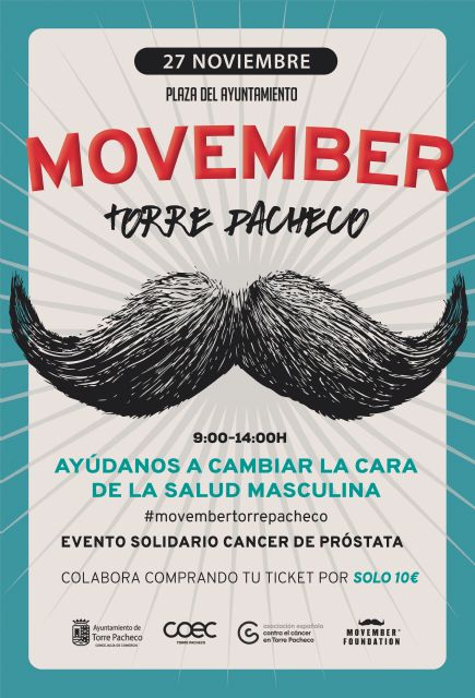 El próximo 27 de noviembre se celebra la segunda edición de Movember Torre Pacheco de 9 a 14 horas en la plaza del Ayuntamiento, con el objetivo de dar visibilidad al cáncer de próstata, el dinero recaudado se destinará a la AECC. Un movimiento mundial, cuyo fin es la investigación del cáncer de próstata y la salud masculina.