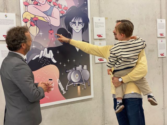 El concejal de Cultura, Raúl Lledó, acompañado por uno de los aristas, Juan Castaño y la bibliotecaria, Juani Sánchez, ha hecho un recorrido por la sala donde artistas como Daniel Acuña, Juan Álvarez y Jorge G., David Cantero, Juan Castaño, Fernando Dagnino, Diana Escribano, Salva Espín, Ana Galvañ, Virginia García, Miguel Herráiz, Magius, Sonia Matas, José David Morales, Carlos Morote, David Navarro e Ilu Ros: han dibujado a una divinidad clásica y a su equivalente en el mundo de los superhéroes; así como a los elementos de las ciencias que han sido bautizados en relación con esa divinidad. Cada panel va acompañado de cartelas explicativas: con los orígenes en la mitología, la explicación sobre el superhéroe, y la relativa a las ciencias.