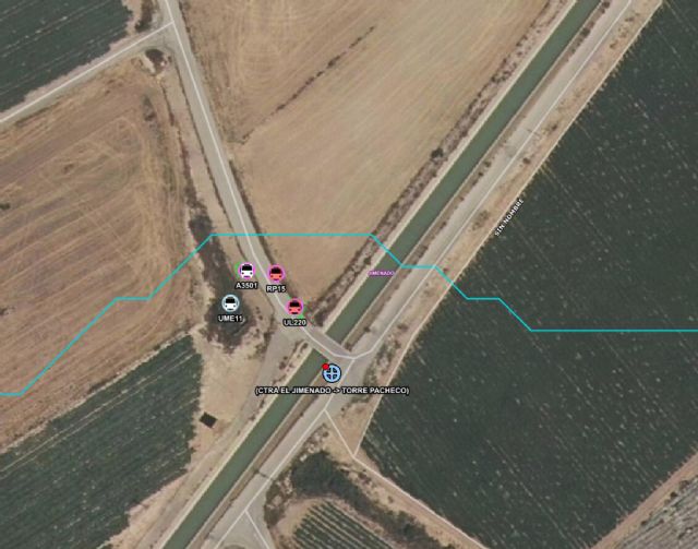 Servicios sanitarios de emergencia han rescatado y trasladado al hospital a los ocupantes del vehículo accidentado al precipitarse su vehículo al canal del trasvase El Chacón, en el puente que une la carretera de El Jimenado con Torre Pacheco.