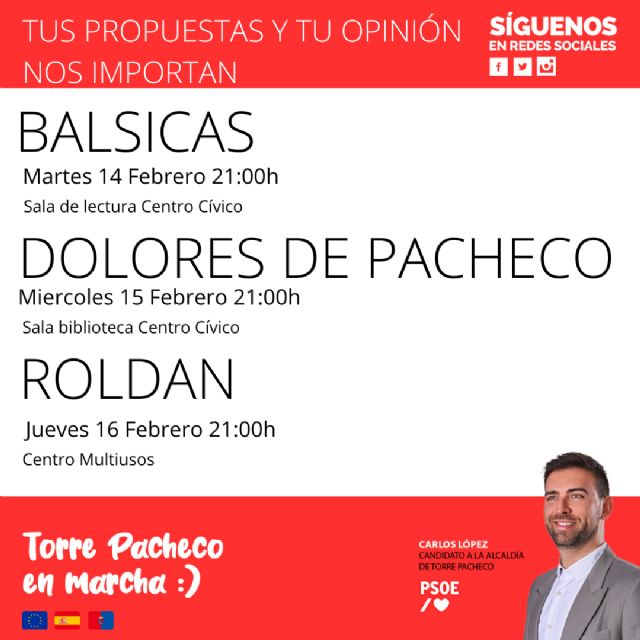 La primera de estas reuniones vecinales será el próximo martes, 14 de febrero, en la Sala de lectura del Centro Cívico de Balsicas y continuarán el miércoles, 15 de febrero, en la Sala biblioteca del Centro Cívico de Dolores de Pacheco y el jueves, 16 de febrero, en el Centro Multiusos de Roldán.