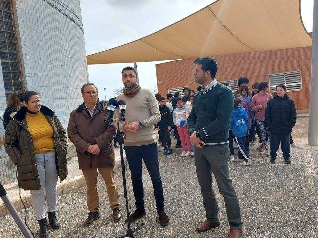 El concejal de Educación, Francisco Sáez, junto a miembros de la Corporación Municipal y el director del centro educativo, Vicente Silla, han podido comprobar la funcionalidad de la nueva pérgola del colegio de la pedanía de Dolores de Pacheco. Su instalación reduce hasta en diez grados la temperatura del sol, poniendo el foco en el bienestar de su alumnado frente a los meses previos al verano.