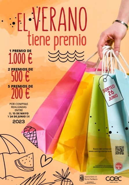 La concejalía de Comercio del Ayuntamiento de Torre Pacheco en colaboración con COEC Torre Pacheco, organiza la campaña comercial “El VERANO TIENE PREMIO”, con premios de 1.000 €, 500 € y 200 €, por compras realizadas entre 15 de mayo y el 24 de junio de 2023. La campaña financiada por la concejalía de Comercio del Ayuntamiento de Torre Pacheco y con la colaboración de COEC Torre Pacheco, pretende continuar con la dinamización y reactivación del comercio local.