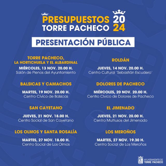 El Ayuntamiento de Torre Pacheco diseña un calendario para presentar a la ciudadanía el Presupuesto Municipal, aprobado recientemente. Además, se aprovecharán los encuentros para exponer futuros proyectos y recoger nuevas demandas ciudadanas.