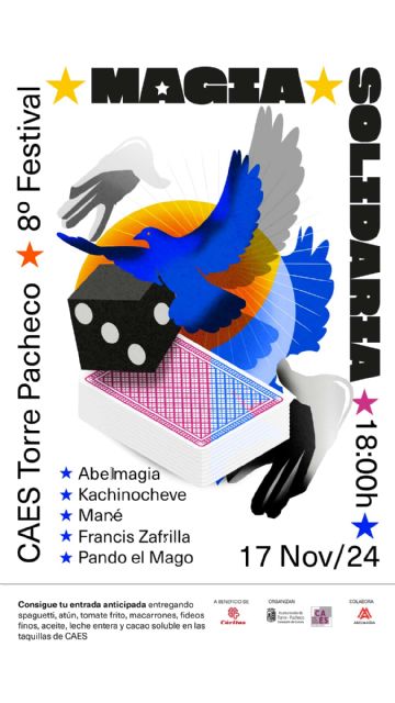 El Ayuntamiento de Torre Pacheco, a través de la Concejalía de Cultura, y AbelMagia presentan la octava edición del Festival de Magia Solidaria. Este año, el espectáculo girará en torno a un sorprendente show "CIR-CO-MÁGICO", donde grandes ilusionistas nacionales deleitarán al público con sus habilidades y crearán una experiencia inolvidable. Conmemorando el Día Internacional de los Derechos del Niño. Consigue ya tu entrada entregando productos para Cáritas Torre Pacheco en taquilla CAES