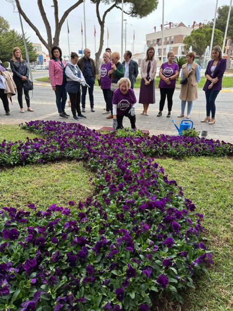 Un lazo con decenas de plantas de “Pensamiento” de flores violetas, para hacernos reflexionar sobre este día, junto a una lágrima que simboliza el dolor y sufrimiento de las mujeres. Las mujeres presentes en el acto han llenado la lágrima de plantas para dar visibilidad y formar parte de la lucha por conseguir la erradicación de la violencia contra las mujeres.