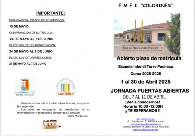 La concejal de Educación, Sunci Pedreño ha informado sobre la apertura del plazo de matrícula de EMEI Colorines, invitando a todos los interesados en asistir a la Jornadas de Puertas Abiertas, del 7 al 11 de abril, en horario de 10 a 12 horas, donde podrán conocer las instalaciones y al personal, así como resolver dudas.