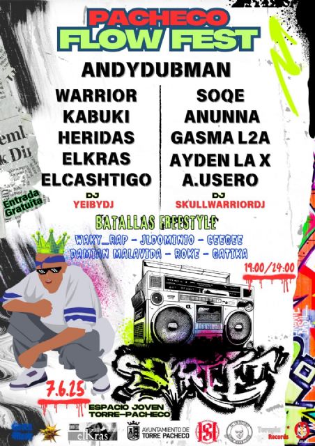 La música urbana tendrá su cita el sábado 7 de junio en el Espacio Joven con el "Pacheco Flow Fest" a partir de las 19 horas, con entrada libre hasta completar aforo.