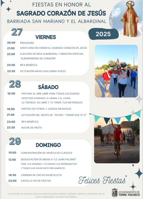 El próximo viernes 27 de junio comienzan las Fiestas de El Albardinal, con la tradicional Procesión por las calles de la localidad y Santa Misa a las 8 de la tarde. Y a las 22.00 horas, la Elección de Miss Albardinal y mención especial Festera "Albardinense de Corazón", para finalizar la jornada, la actuación del Mago Guillermo Aviles.