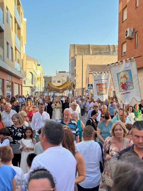 Tras la Misa en la Iglesia Ntra. Sra. del Rosario, celebrada por nuestro párroco, Manuel Verdú y concelebrada por nuestro vicario parroquial, Vladimir Revutskyy; la Custodia salió a la calle recorriendo los 12 altares, primorosamente adornados, junto con los niños que han comulgado este año, catequistas, familiares, vecinos, miembros de la Hermandad de Nuestra Señora del Rosario, Caballeros Portapasos, Damas de la Virgen, así como el alcalde de Torre Pacheco, Pedro Ángel Roca, la diputada Regional, María Luisa Ramón, y miembros de la Corporación Municipal, con la música de la Agrupación Musical Ntra. Sra. del Pasico.